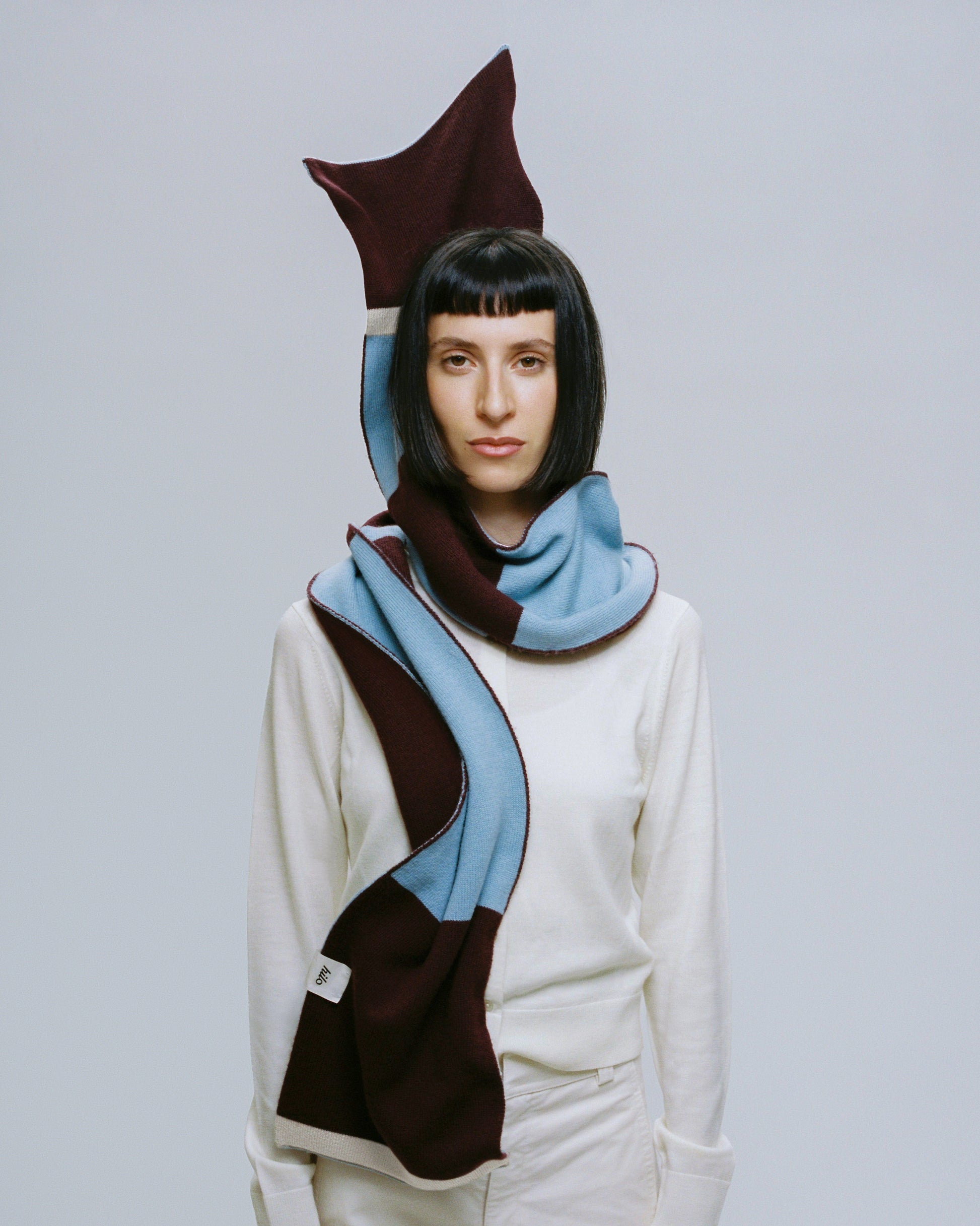 A deep burgundy paired with sky blue and cream, the Eri scarf offers contrast with subtle richness. Elegant but bold, it's well suited for colder months and complements both bright and muted wardrobes. Woven from 100% Merino wool, it's naturally insulating, soft, and skin-friendly.